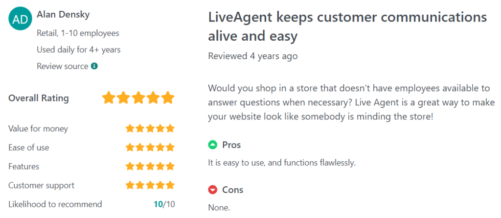“¿Comprarías en una tienda que no tiene empleados disponibles para responder preguntas cuando sea necesario? ¡LiveAgent es una excelente manera de hacer que tu sitio web parezca que alguien está atendiendo la tienda!”